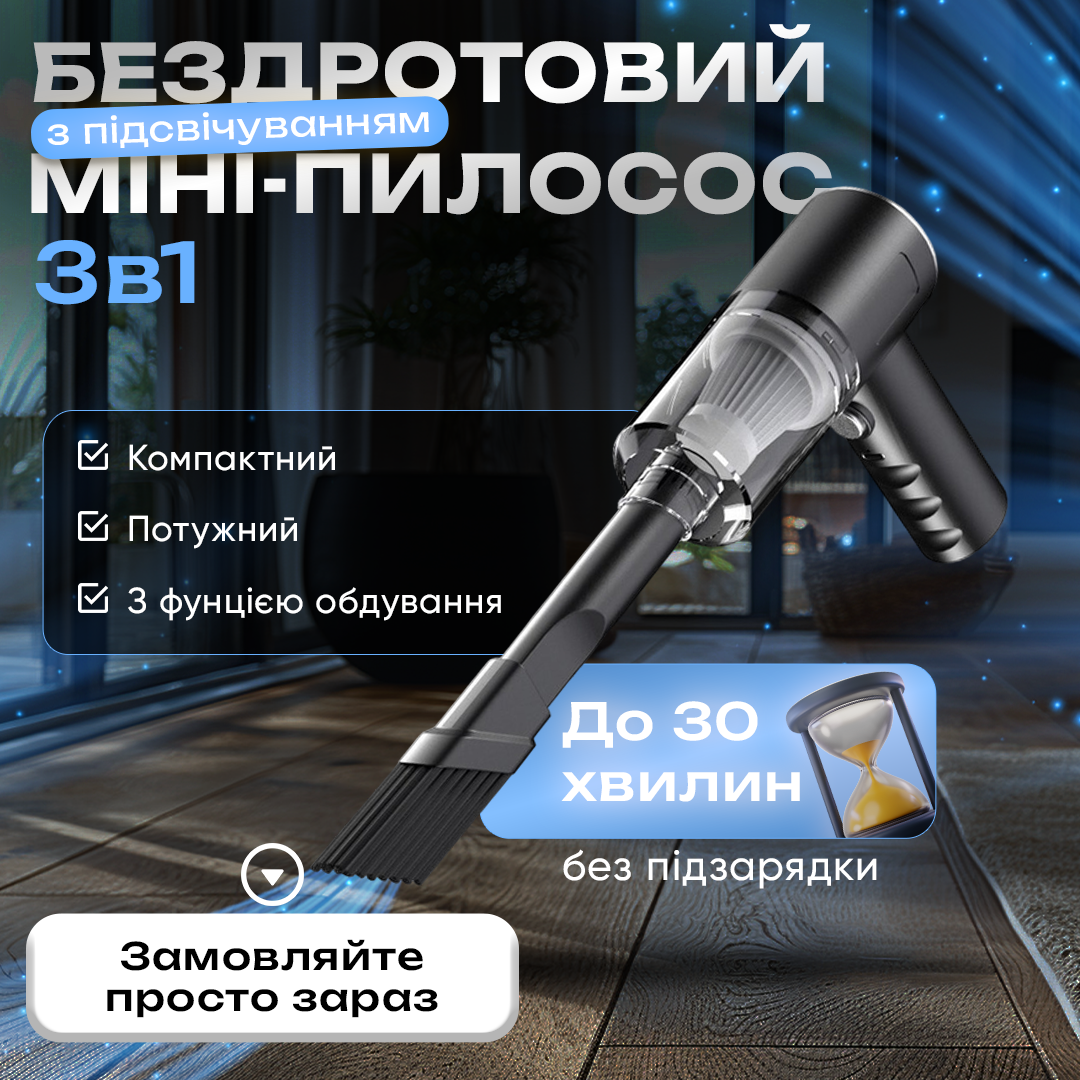 Багатофункціональний міні-пилосос 3 в 1 — це ручний автомобільний пилосос з різними насадками для прибирання, продувки та відкачування.